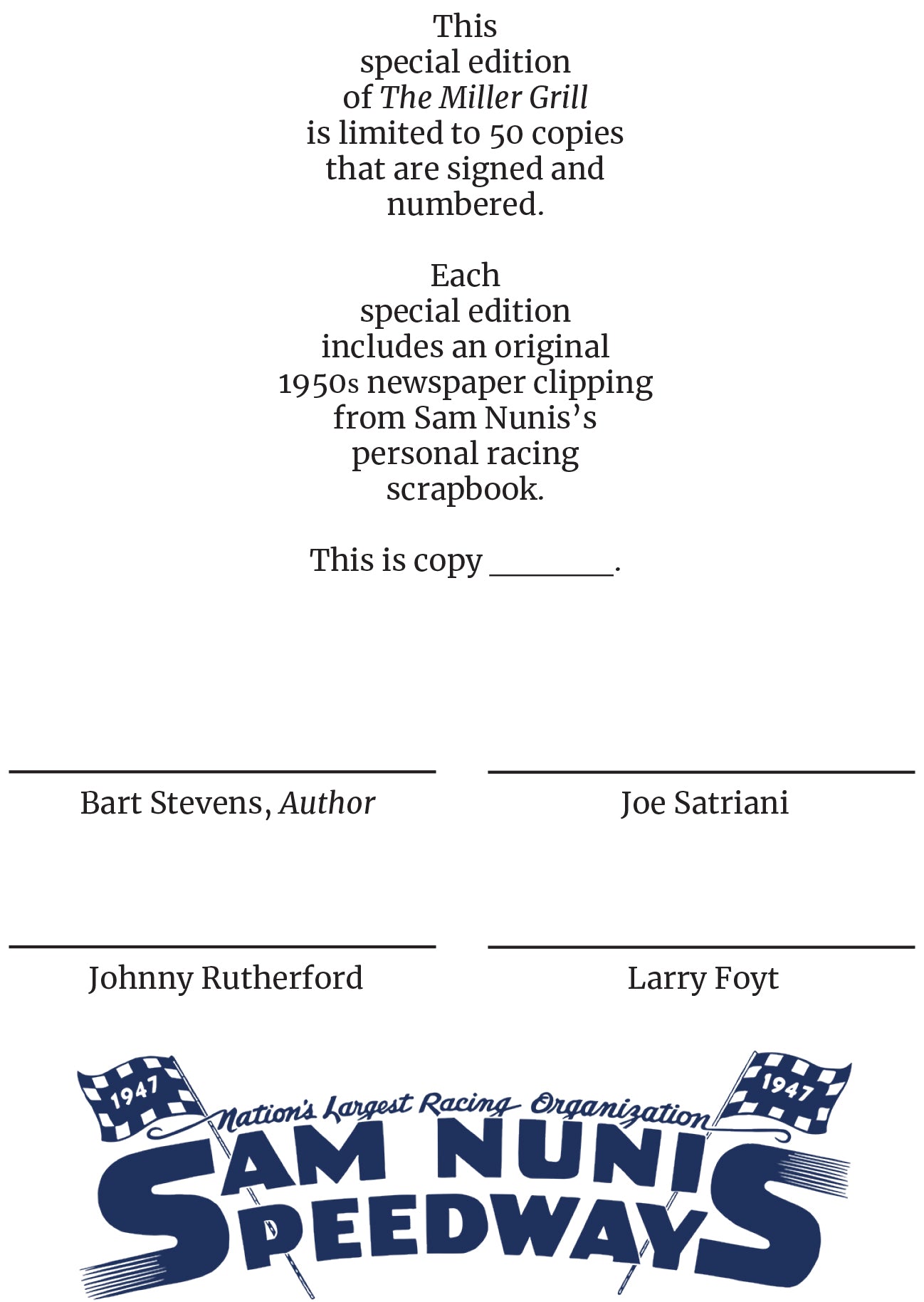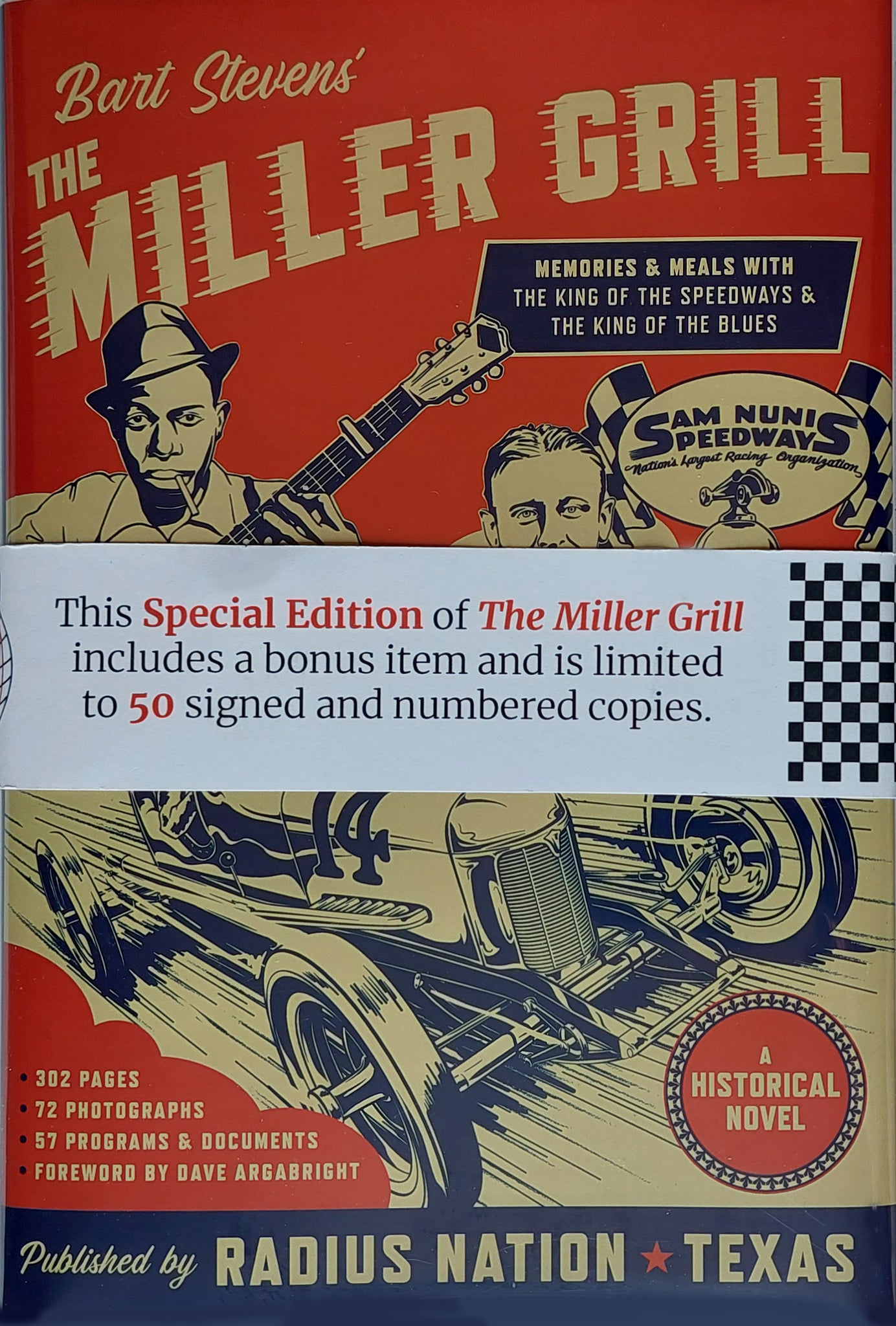 The Miller Grill SPECIAL EDITION is limited to 50 numbered and signed copies. The SPECIAL EDITION includes an archival-safe dust jacket cover, belly band, and signatures from the author and blurb contributors - Bart Stevens, Joe Satriani, Johnny Rutherford, and Larry Foyt.