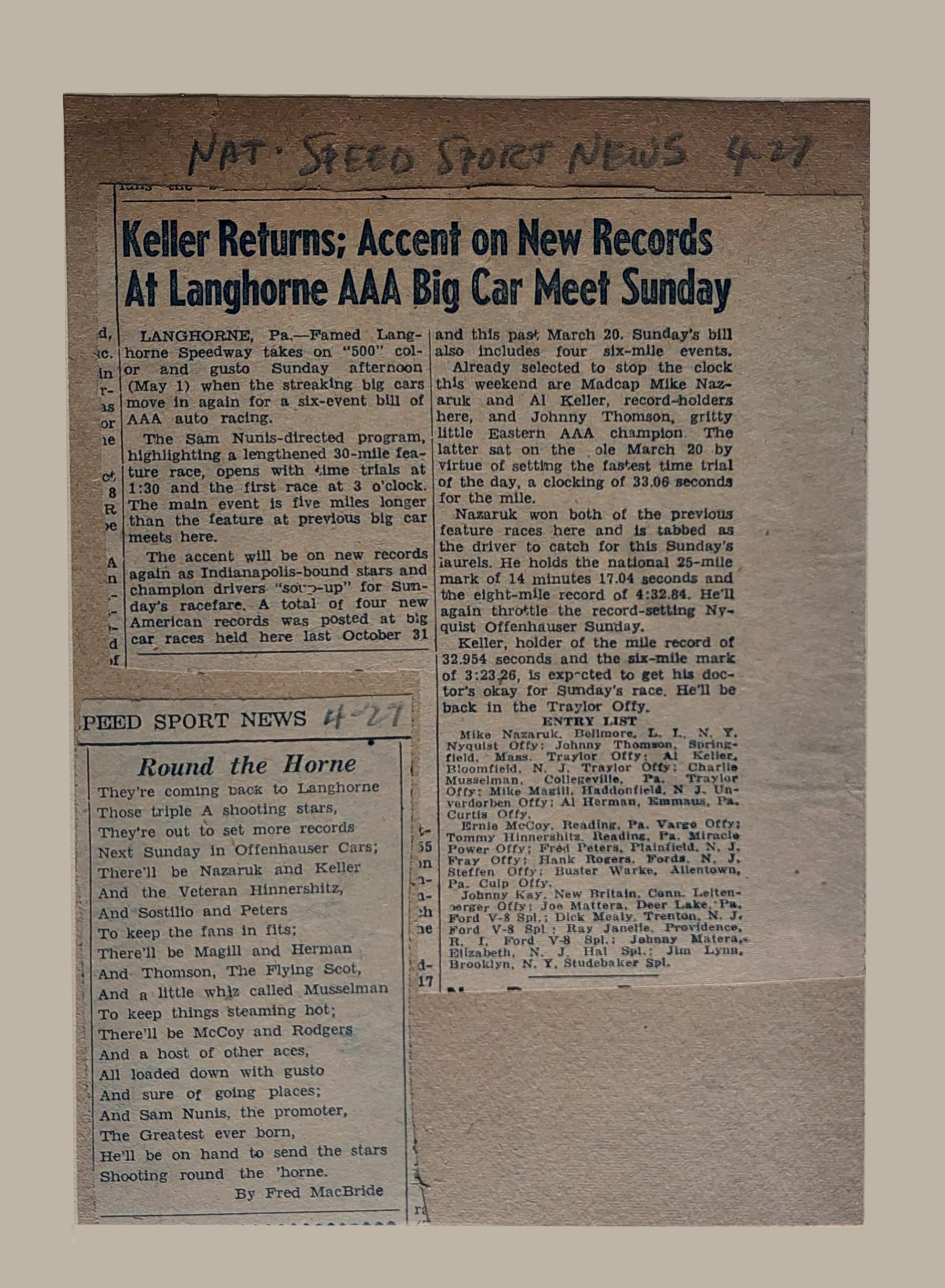 Also included with the SPECIAL EDITION is an original, unique newspaper clipping from Sam Nunis's personal racing scrapbook. The clippings features a Sam Nunis Speedways race.